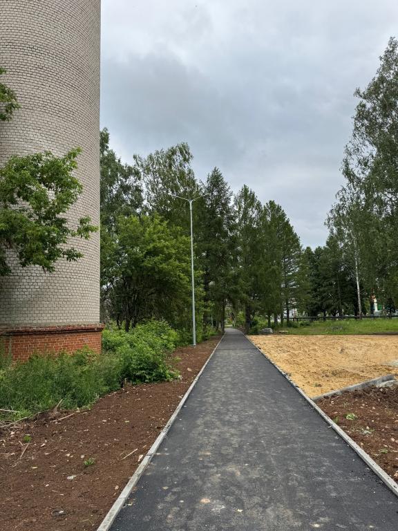 Работы проводятся поэтапно. Сейчас здесь обустроена тротуарная дорожка и проведено освещение. В планах — установка детской площадки с горками и качельками, скамеек и урн. Старая водонапорная башня, около которой располагается сквер, станет арт-объектом.