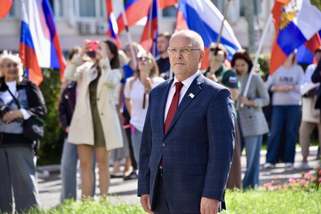Почётное право поднять один из главных государственных символов страны было предоставлено бойцу СВО, младшему лейтенанту Александру Кармаенкову.