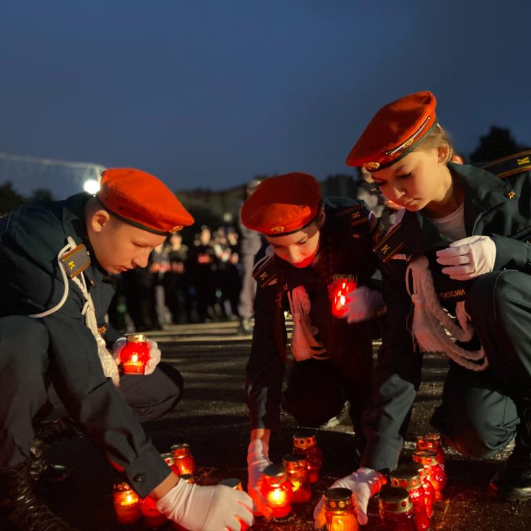 Память погибших почтили минутой молчания. Из зажжённых свечей выложили слова: «Беслан», «Москва», «Донбасс», «Курск. Помним».