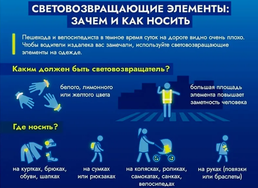 Госавтоинспекция напоминает, что при движении в темноте с ближним светом фар водитель автомобиля способен увидеть пешехода на дороге на расстоянии 25-50 метров. Если пешеход применяет световозвращатель, то это расстояние увеличивается до 150-200 метров. А при движении автомобиля с дальним светом фар дистанция, на которой пешеход со световозвращателями на одежде становится виден, увеличивается со 100 метров до 350 метров. Это даёт водителю 15-25 секунд для принятия решения.