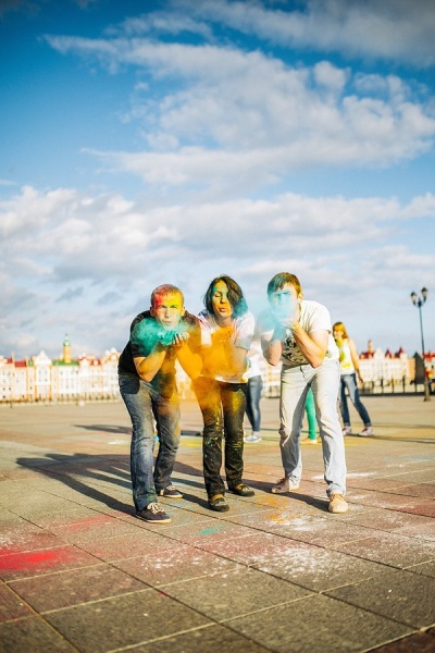 «Организаторы мероприятия — просто веселые и активные йошкаролинцы. Мы не профессионалы в организации праздников. Однако фестиваль красок не первый наш опыт в организации массовых праздников. В 2012 году мы уже пробовали массовый запуск небесных фонариков. Делали мы это для себя, чтобы повеселиться и показать людям, насколько это классно быть сплоченными, — рассказывает агентству одна из организаторов Вера Муравьева. — В этом году мы побывали на фестивале красок в Москве. Там было очень здорово и, вернувшись, мы решили — почему бы и нам не устроить праздник для всего города. Вообще фестиваль красок пришел к нам из Индии, где ежегодно в праздник весны (известный как „Холи“) мужчины и женщины, старики и дети посыпают друг друга цветным порошком и обливают друг друга подкрашенной водой. Считается, что чем обильнее покрывают одежду человека краски, тем больше хороших пожеланий и позитива направлено в его адрес.