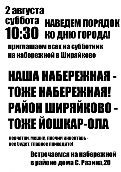 МариМедиа, 1 августа. В субботу, 2 августа, на набережной в микрорайоне «Ширяйково» состоится субботник. Все желающие встречаются в 10:30 возле дома по адресу Степана Разина, 20.