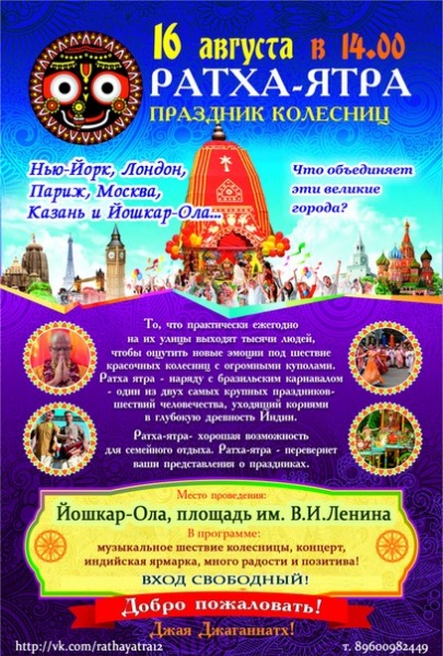 МариМедиа, 15 августа. В субботу, 16 августа, на площади им. В. И. Ленина столицы Марий Эл пройдет красочный праздник Ратха-Ятра. «Ратха» в переводе с санскрита означает «колесница», «ятра» — «процессия». Это древний праздник, который зародился в Индии. Именно там, в городе Пури штата Орисса, ежегодно проводится самый масштабный фестиваль Ратха Ятра, куда съезжаются тысячи людей со всего мира.