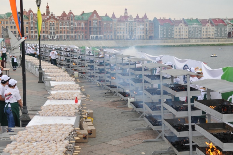 Многие из тех, кто мужественно работал у специально оборудованных мангалов, рекордсмены со стажем, они принимали участие в установление двух предыдущих рекордов России: самый длинный шашлык 2012 года и самый длинный бутерброд 2013 года.