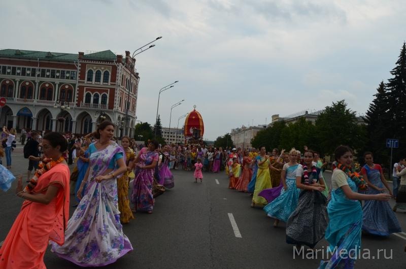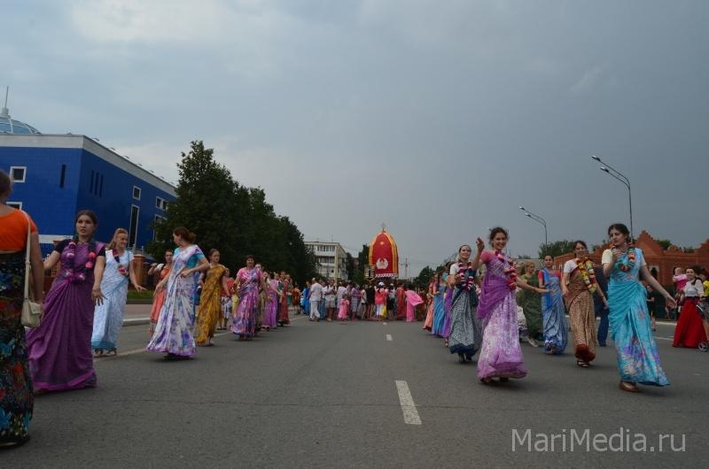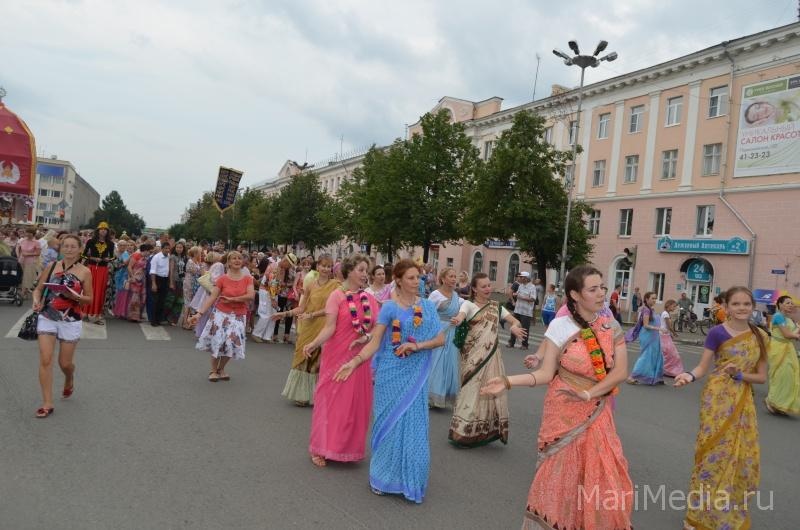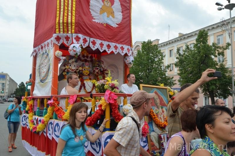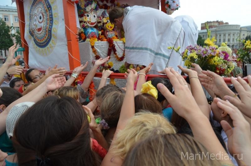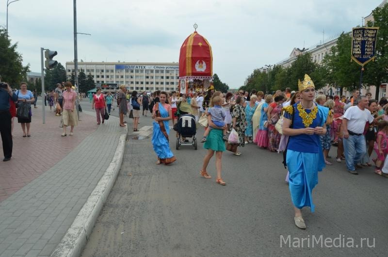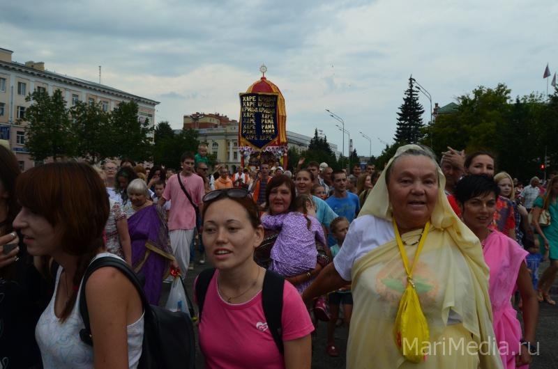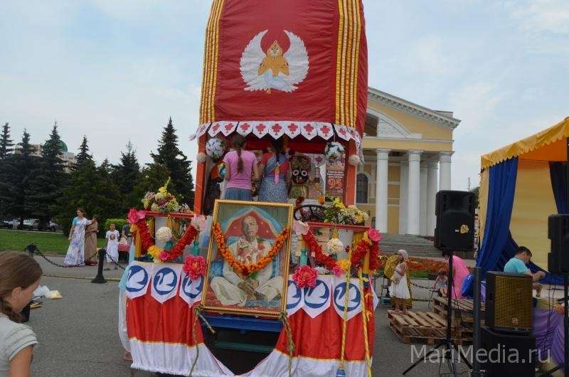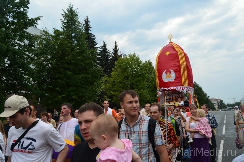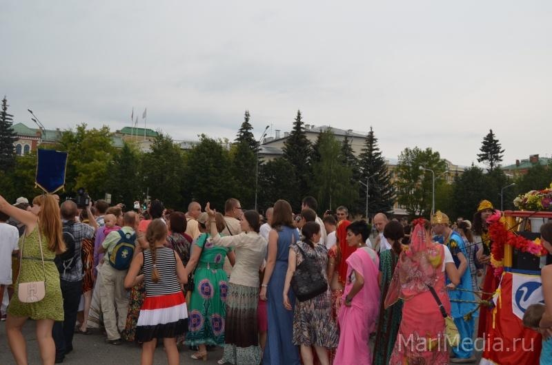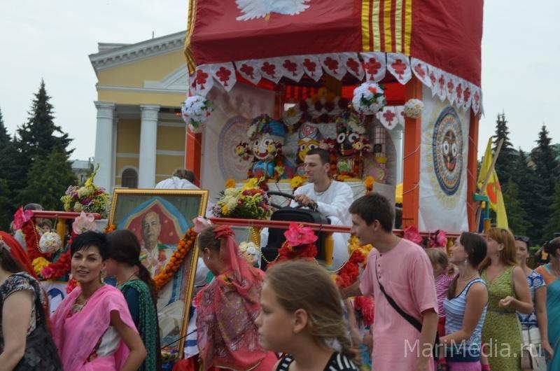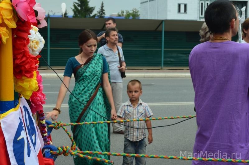 МариМедиа, 17 августа. В субботу в Йошкар-Оле впервые прошел праздник колесниц — древний ведический праздник «Радха-Ятра». Его организаторы вместе с участниками тянули за канаты колесницу, напевая священную мантру.