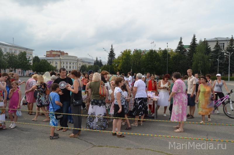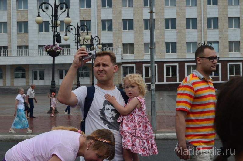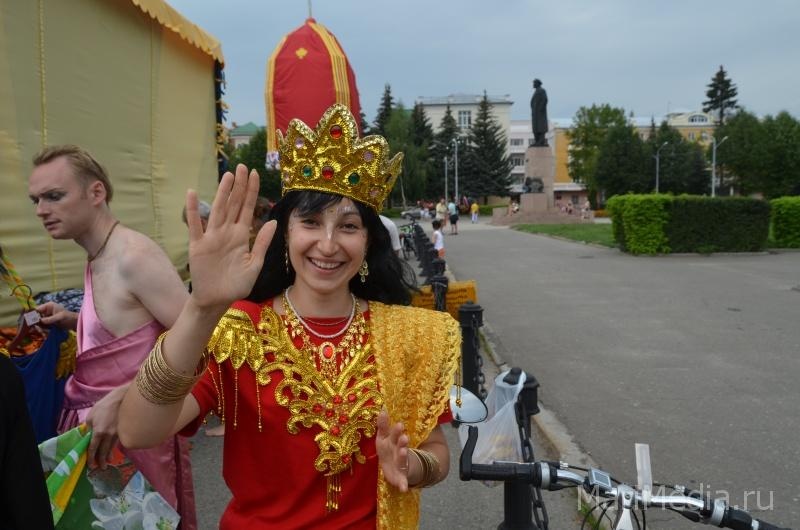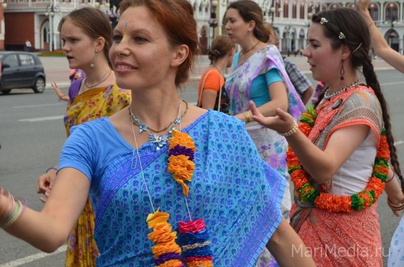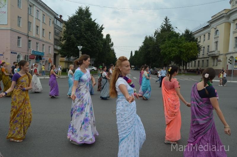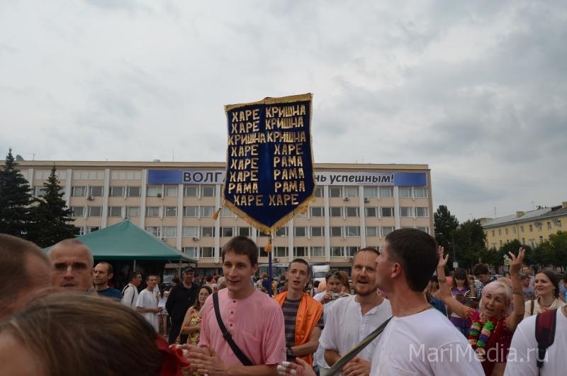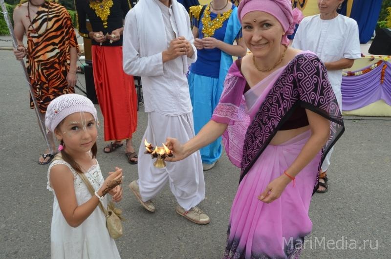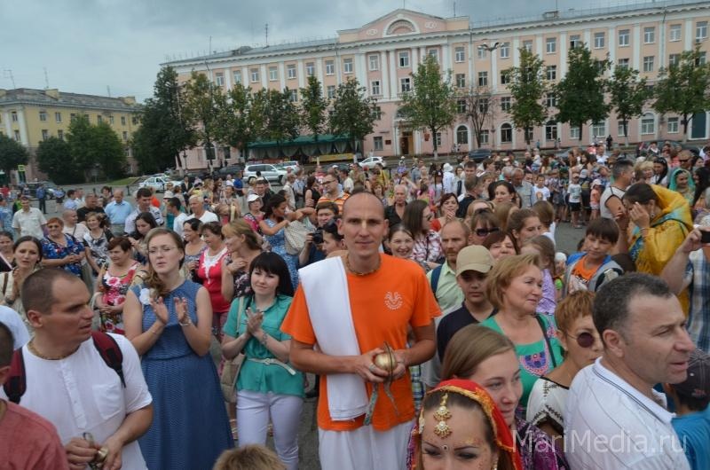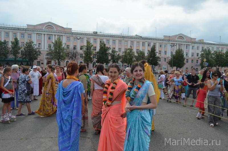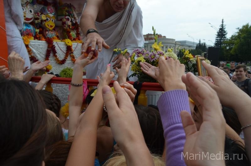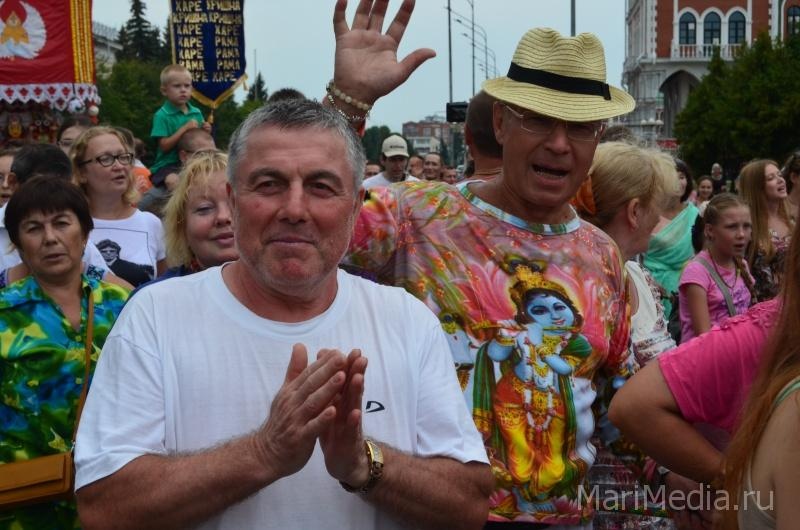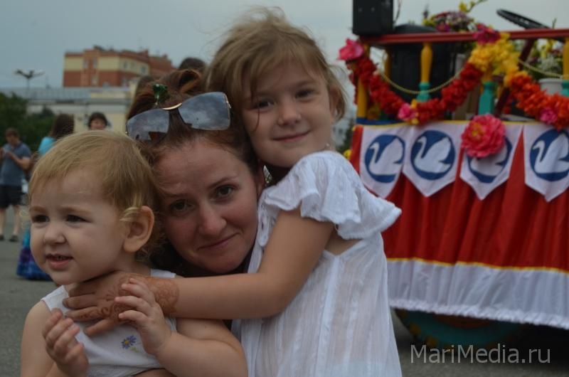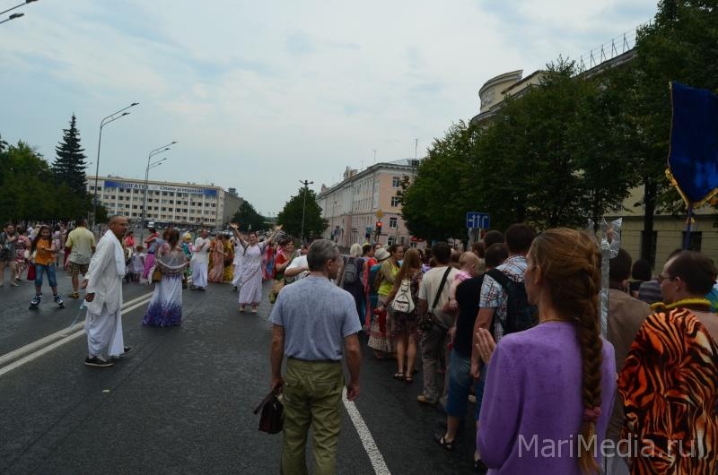 МариМедиа, 17 августа. В субботу в Йошкар-Оле впервые прошел праздник колесниц — древний ведический праздник «Радха-Ятра». Его организаторы вместе с участниками тянули за канаты колесницу, напевая священную мантру.