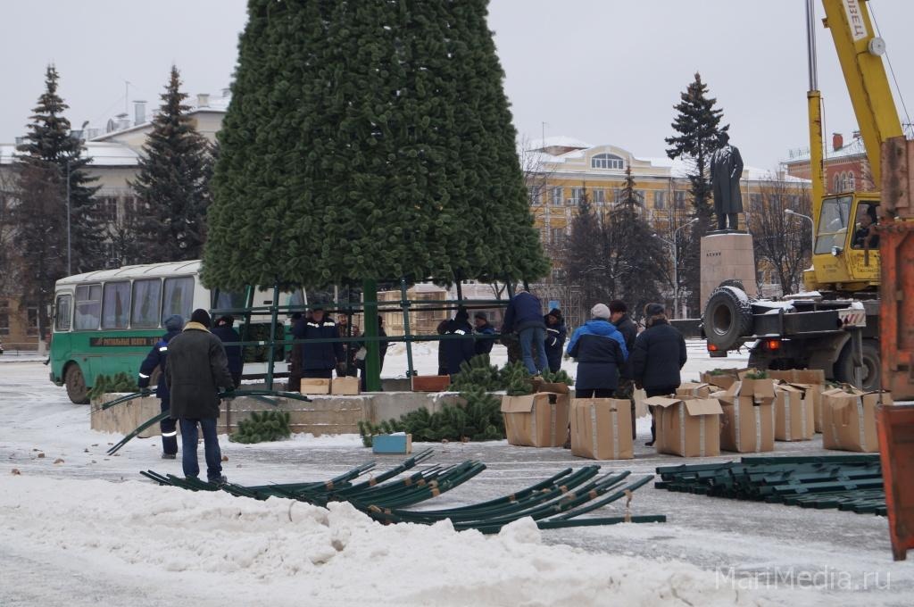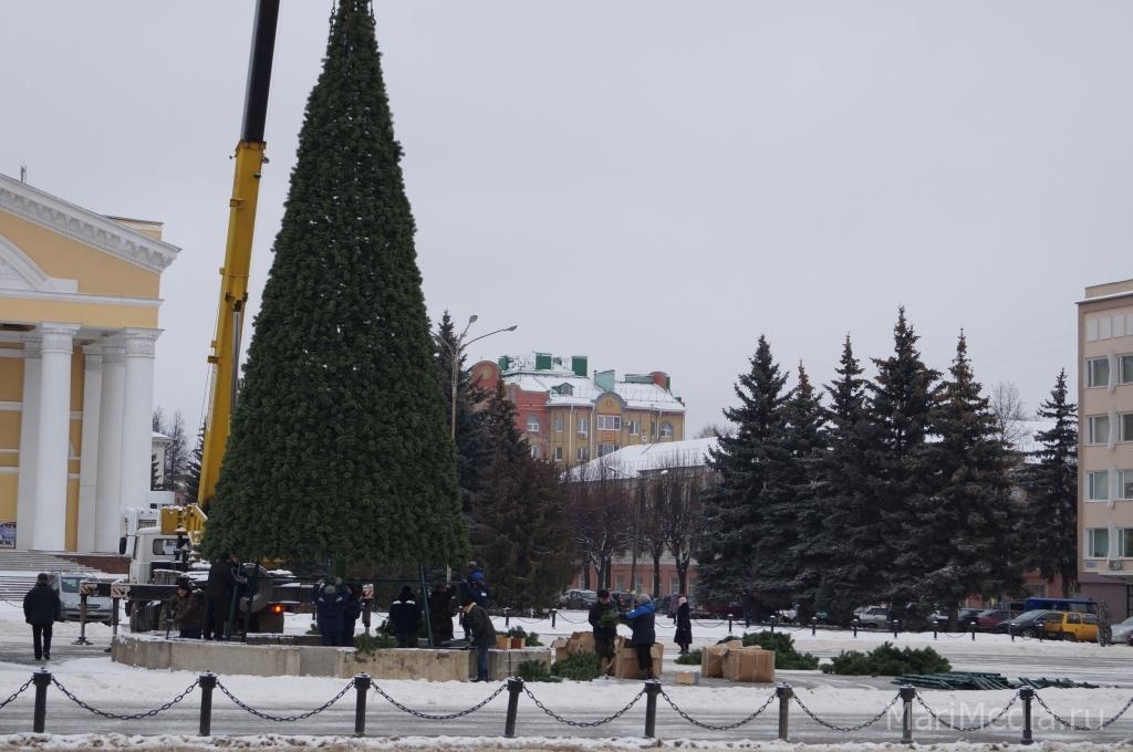 МариМедиа, 10 декабря. Сегодня на площади им. В.Ленина специалисты муниципального предприятия Треста банно-прачечного и ритуального хозяйства проводят монтаж новогодней ели. Они отмечают, что проблем с установкой не возникает, погодные условия благоприятные.