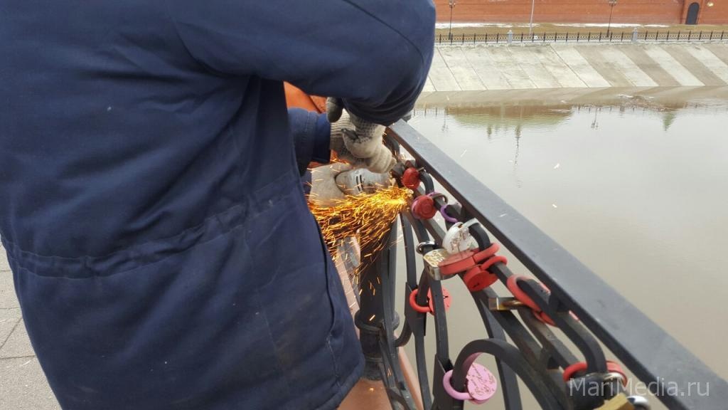 МариМедиа, 12 апреля. В городе началась зачистка мостовых переходов. Коммунальщики столицы срезают навесные замки молодоженов, в разное время «украсившие» перила Воскресенского моста. По словам специалистов МУП «Город», замки выбрасывать не будут, хозяева смогут их забрать непосредственно на предприятии.