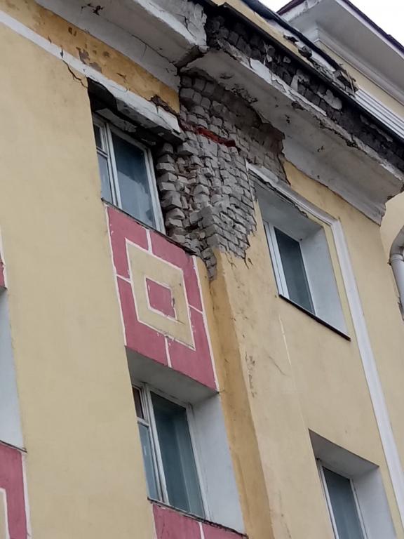 Четырёхэтажный кирпичный дом построенный в 1959 году начинает разрушаться. На фотографиях, присланных жильцами дома, видно, как крошится фасадная кирпичная кладка на 4-ом этаже, создавая реальную угрозу для тех, кто в этот момент может находится рядом со зданием.