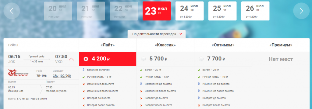 В понедельник, 8 июля, был запланирован первый авиарейс «Москва — Йошкар-Ола». Самолёт компании «РусЛайн» должен был вылететь из Внуково в 21:50. К сожалению, планы так и остались планами. Рейс отменён. В приёмной йошкар-олинского аэропорта причину того, что самолёт из Москвы не прилетит в столицу Марий Эл, озвучить не смогли. Но сказали, что перелёты должны всё-таки возобновиться через 2 недели, 22 июля. На сайте компании на эту дату мест уже нет. Зато можно вылететь 23 июля из Йошкар-Олы в Москву. Стоимость билета — 4585 рублей.