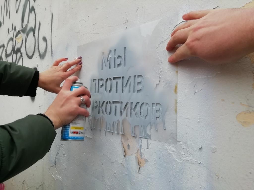 Участники акции — студенты-волонтеры, со стен зданий, строений, сооружений удалили порядка 30 надписей о продаже запрещённых законом веществ, заклеив их социальной рекламой.