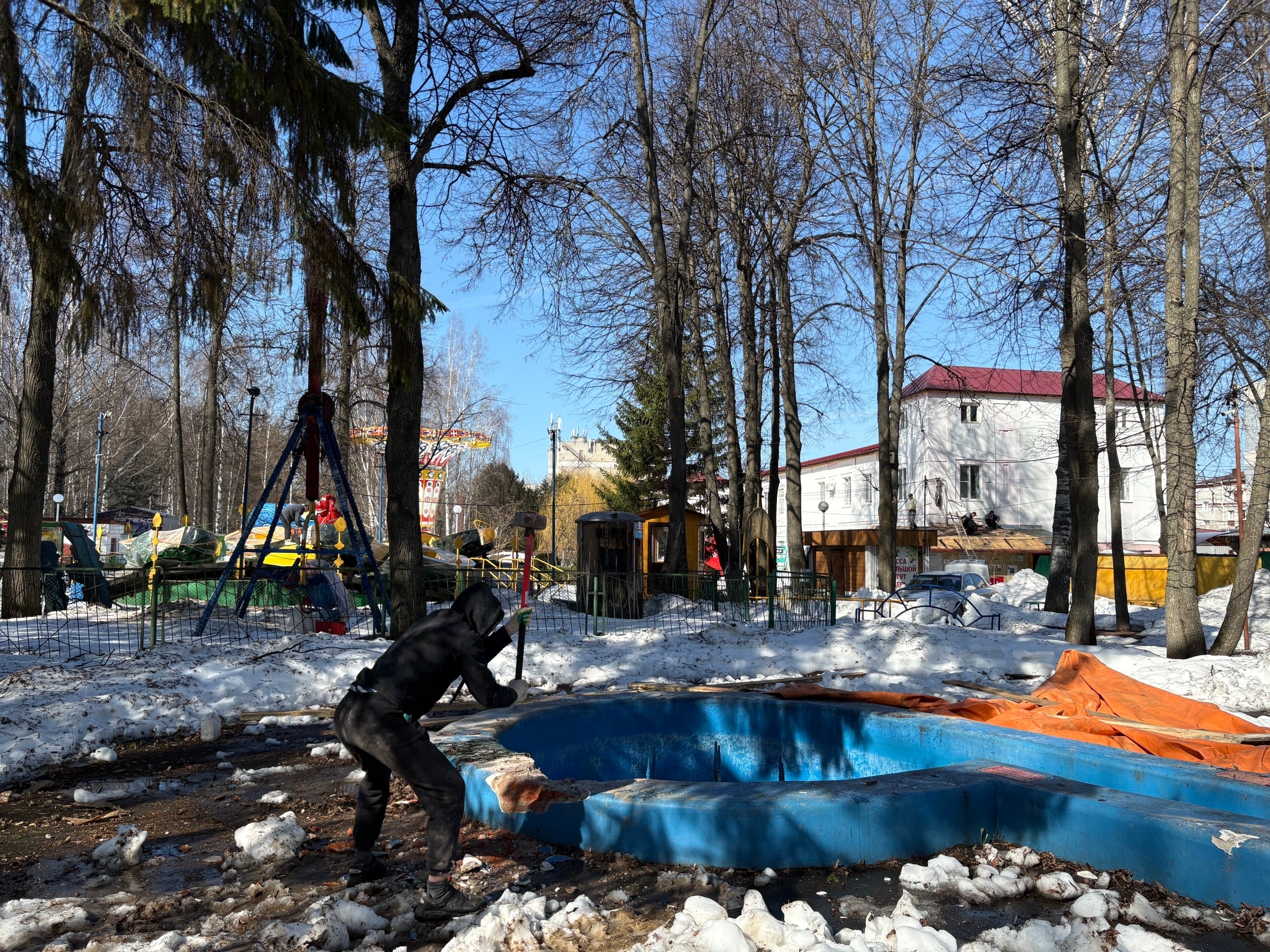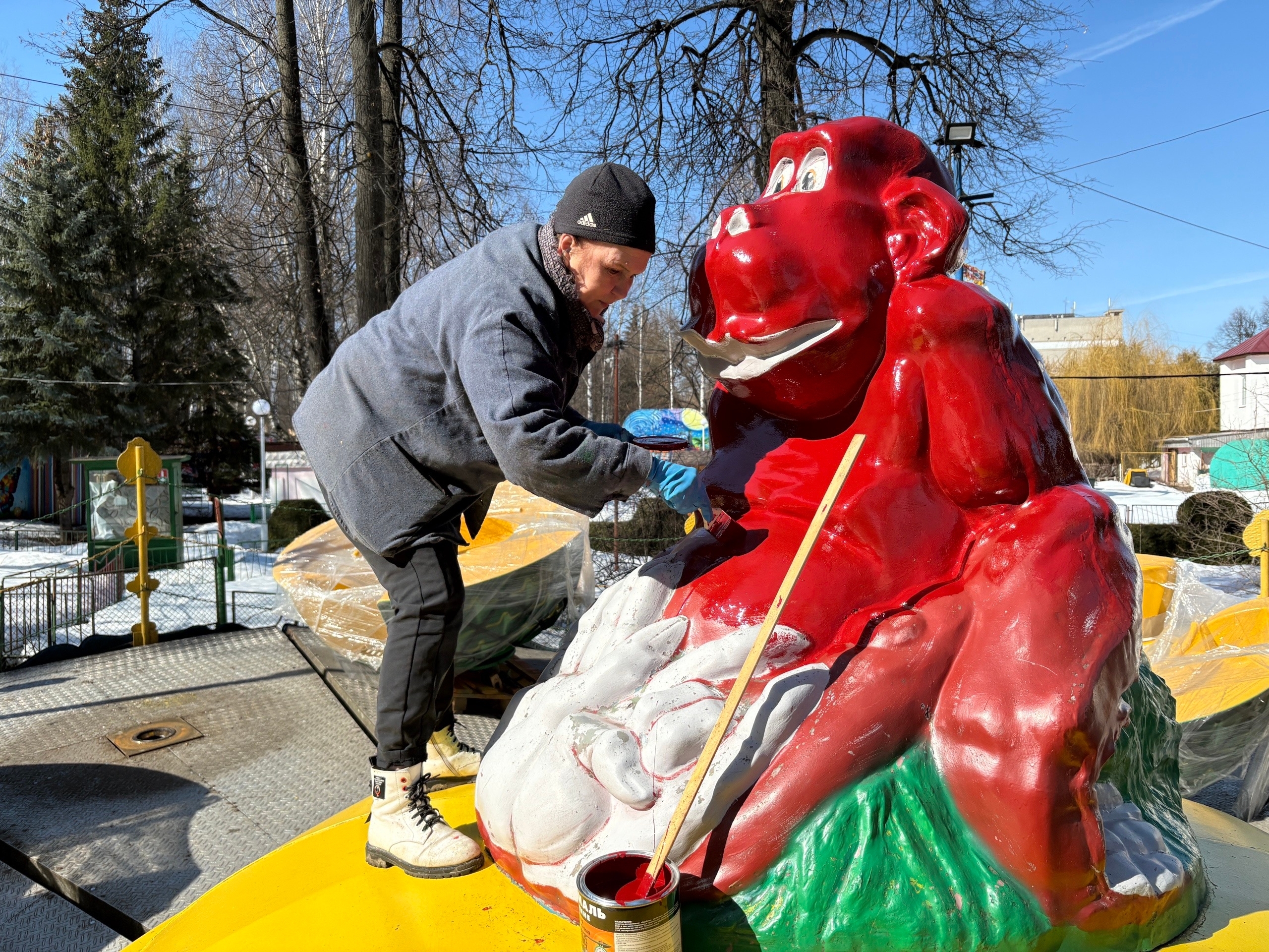 Кроме того, продолжаются и сезонные работы. Здесь подкрашивают аттракционы и лавочки, готовят территории к будущим посадкам цветов и кустарников.