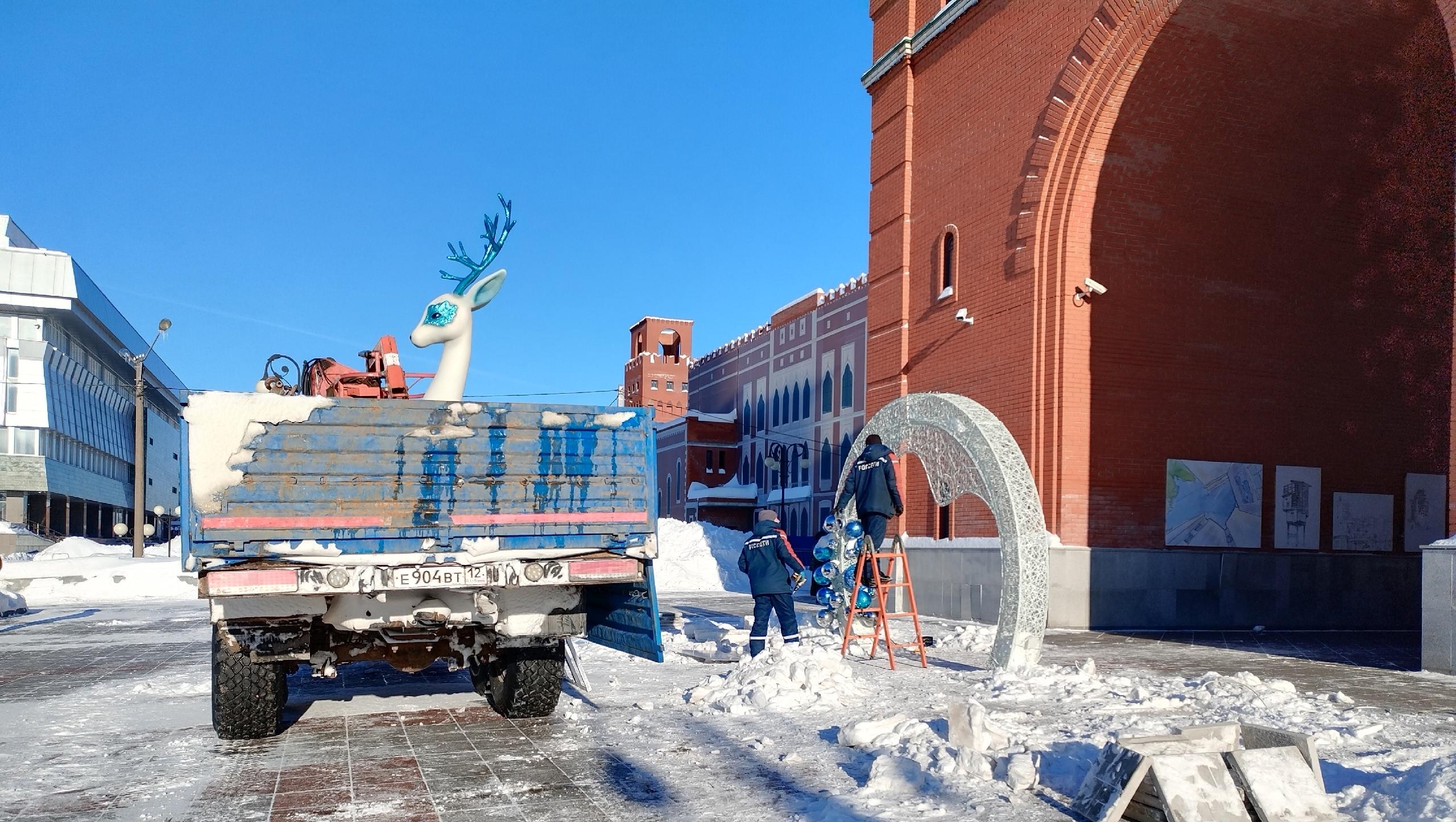 Поводом для демонтажа послужило ночное происшествие. Как писало сегодня ИА МариМедиа, неизвестные оторвали несколько шаров и раскидали их по площади.