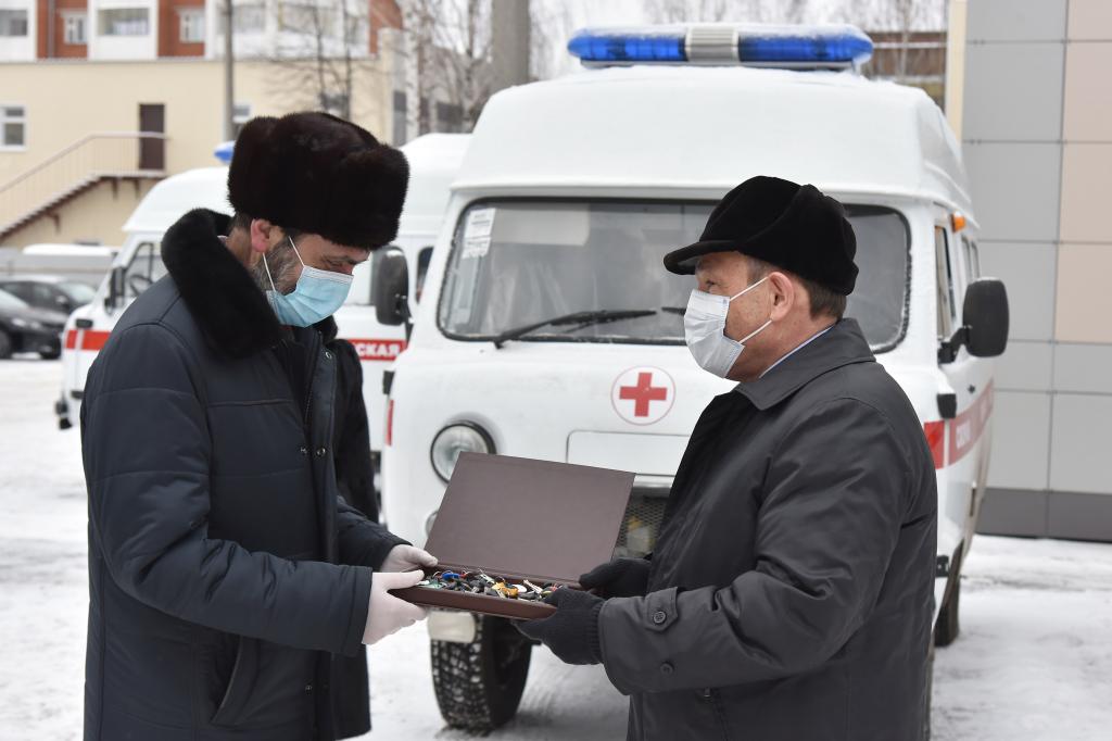 Александр Евстифеев сегодня вручил ключи от новых машин главному врачу Станции скорой медицинской помощи Валерию Манукянцу.