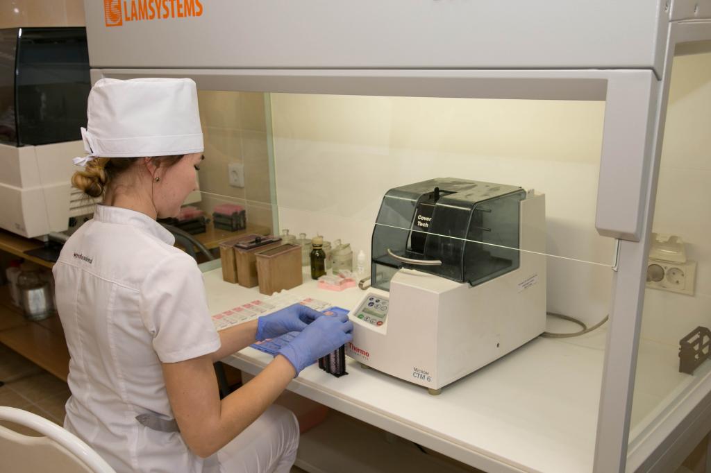 «В лаборатории цитологии будет осуществляется процесс скрининга по ранней диагностике рака шейки матки. Это единствен программа в округе, которая поставлена на такой большой поток и объем. Благодаря таким исследованиям ранее удалось выявить порядка 10 процентов женщин детородного возраста с патологией, и при нашем заключении и своевременном лечении им были сохранены репродуктивные органы, и они родили здоровых детей», — рассказал главный патологоанатом республики Артем Зуев.