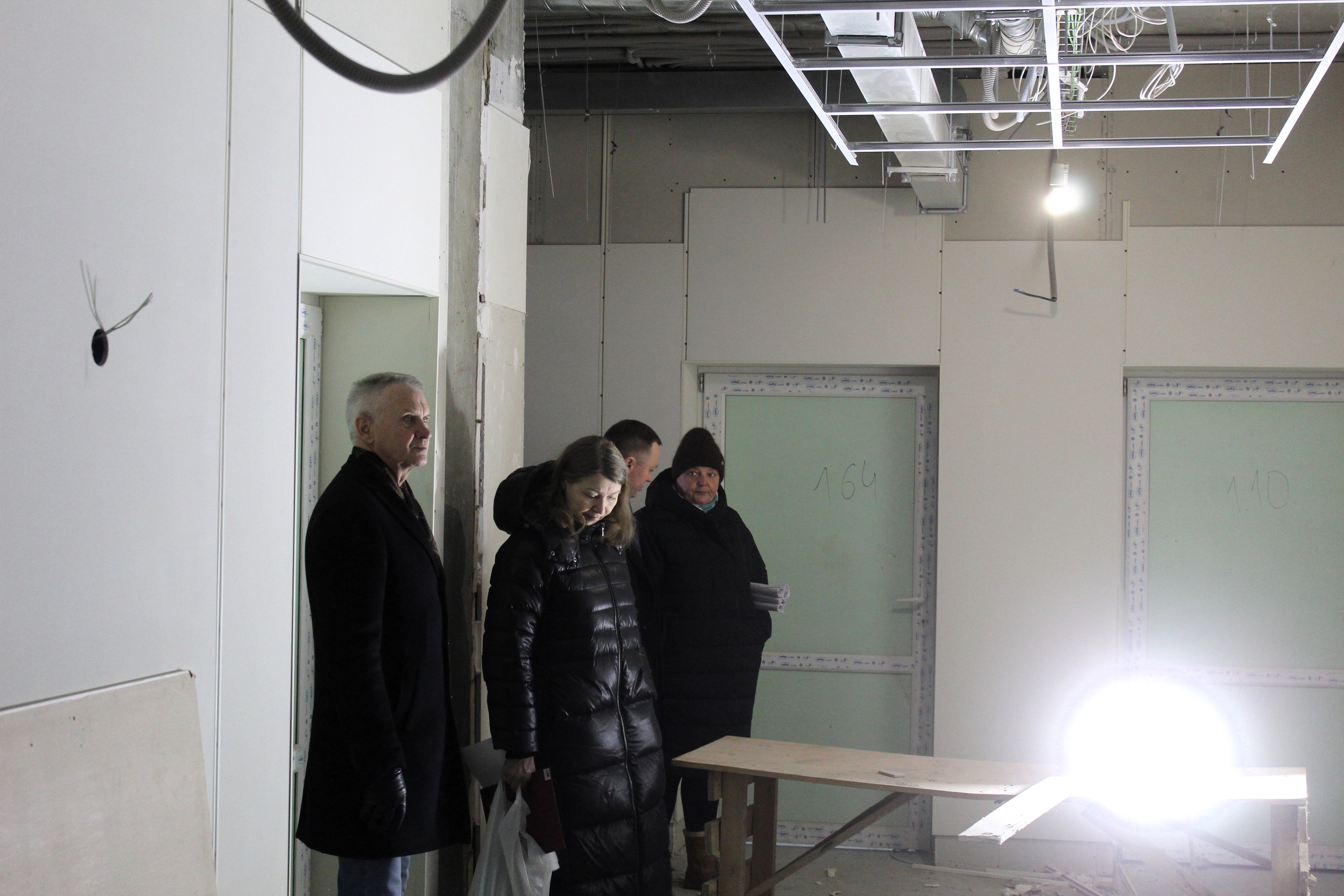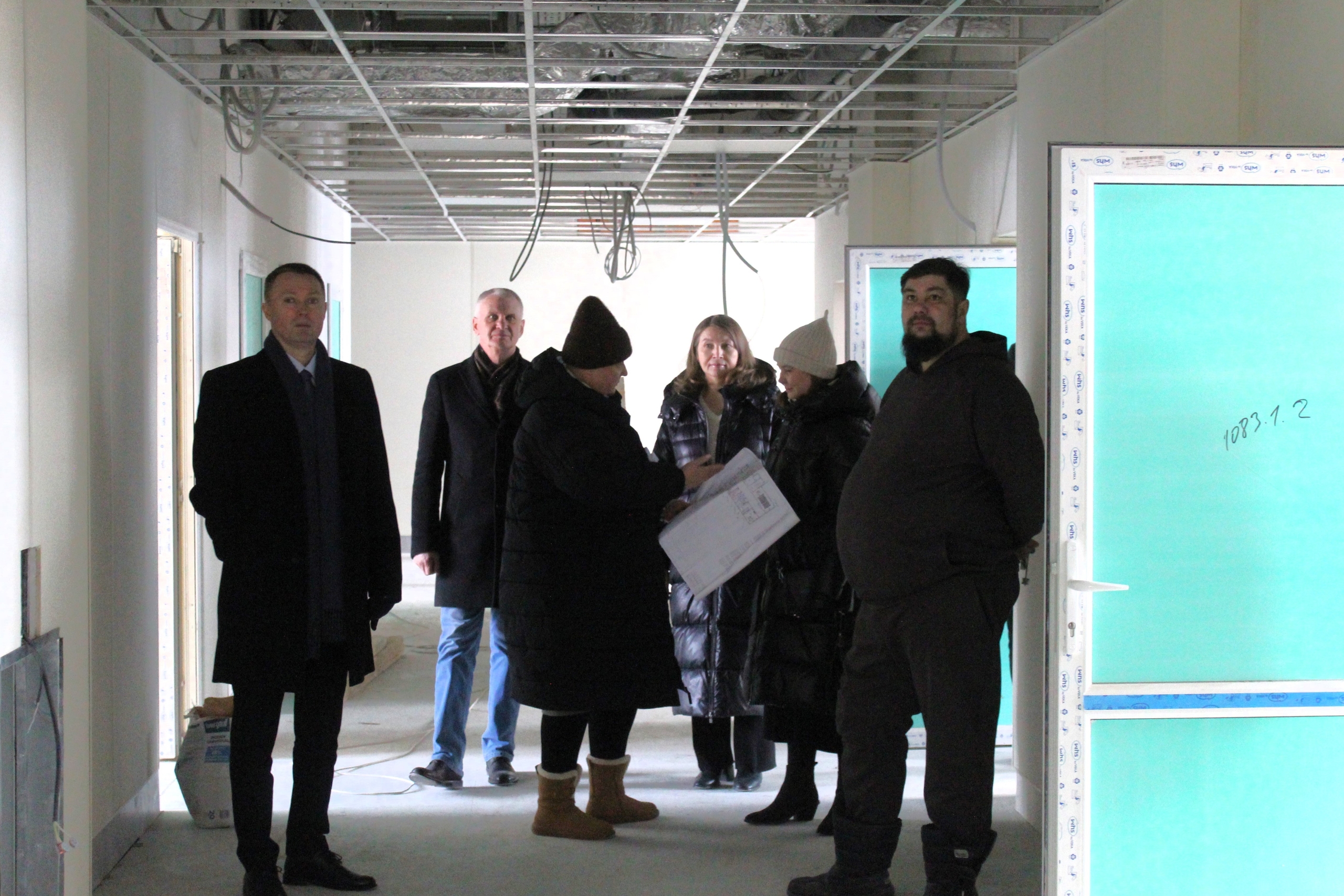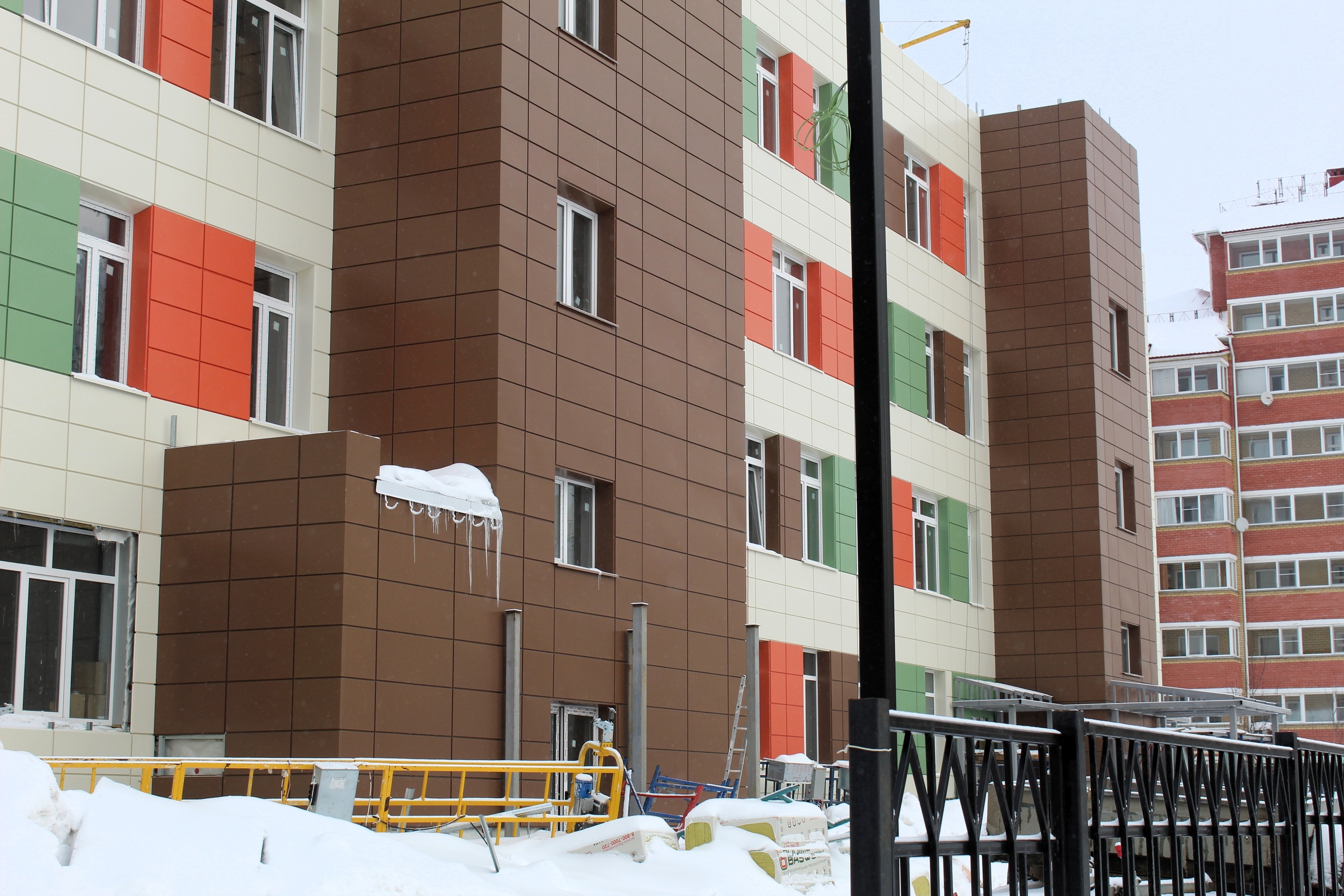 Сейчас на объекте выполняют внутреннюю отделку помещений, обустраивают навесной вентилируемый фасад, крыльцо входа в здание. Также проводятся электромонтажные работы, укладка линолеума и устройство подвесных потолков.