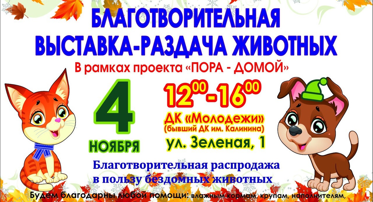 В эту субботу состоится выставка-раздача животных. На этой выставке будет можно выбрать себе питомца. В эту субботу будет много щенков. Будет проведена благотворительная распродажа, на оплату долгов перед клиниками. Можно будет приобрести много интересных вещей и помочь бездомным животным.