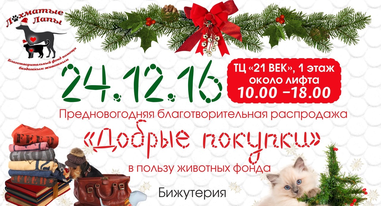 Предновогодняя благотворительная распродажа "Добрые покупки" в пользу животных фонда "Лохматые лапы". На распродаже вы сможете приобрести: бижутерию, одежду, книги и сувениры.