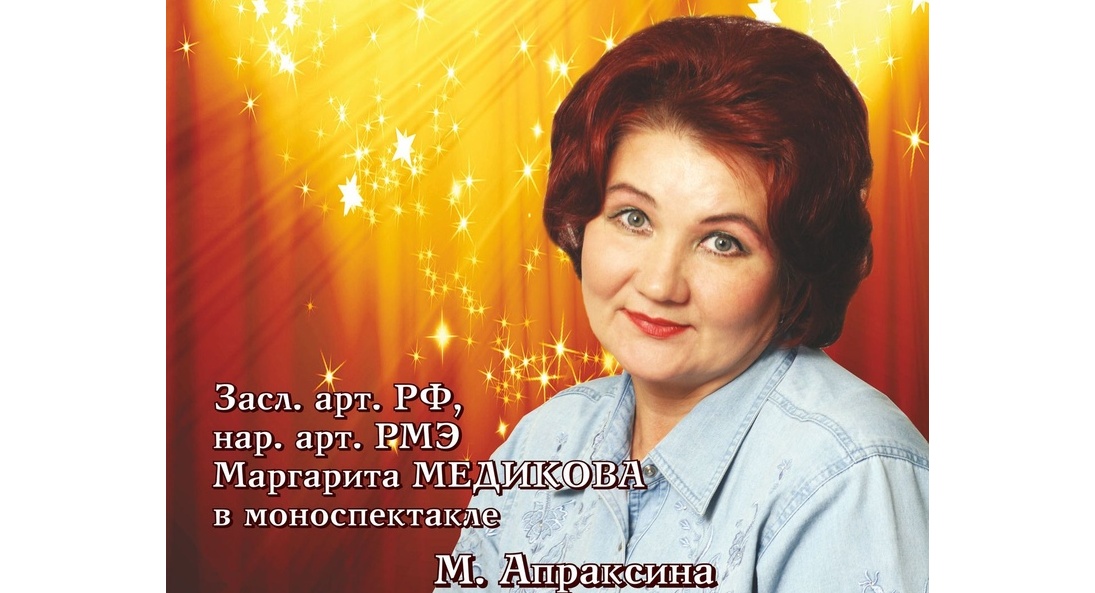 «Без слез не взглянешь» — так называется новая самостоятельная работа заслуженной артистки РФ, народной артистки РМЭ Маргариты Медиковой. Над этим моноспектаклем по одноименной пьесе М.Апраксиной актриса работала и как режиссер.