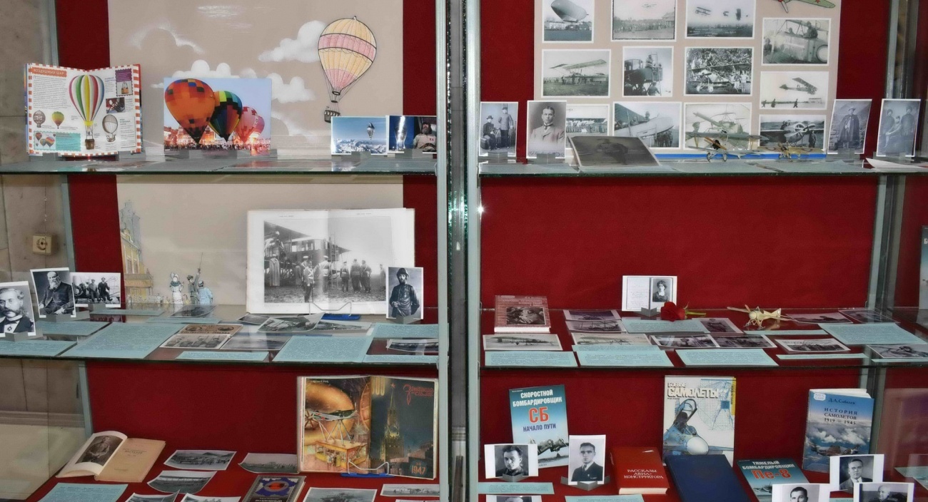 В экспозицию включены документы, фотографии, макеты авиатехники, книги, периодические издания, посвящённые становлению отечественной авиации.
