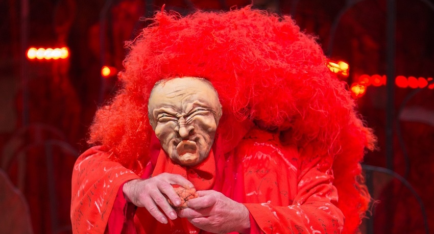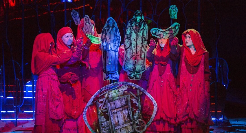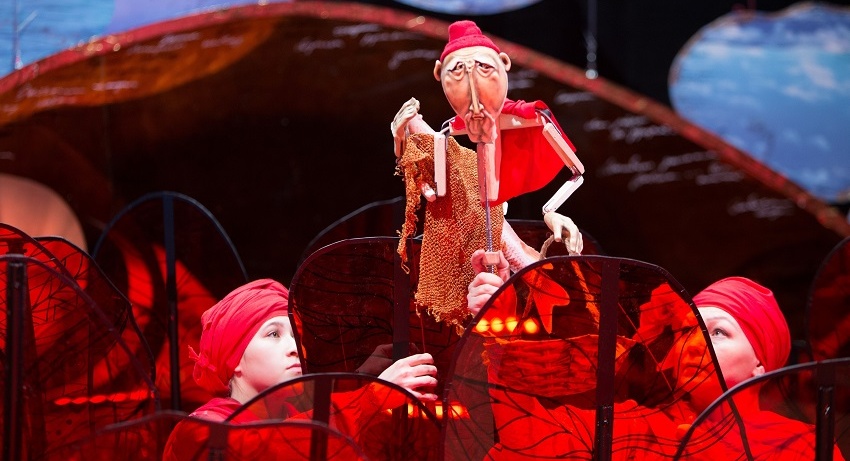Спектакль «О рыбаке...» представлен в трех планах. Начинается он с некоего мастер-класса по работе с куклой-гапитом (тренировочной куклой). Актеры примериваются к куклам, и вдруг один пробует себя в роли старика, а другая — в роли старухи. Так происходит постепенный переход в сказку. Второй план — это воспоминания стариков об их прошлом, о пережитых вместе годах. А третий план — это уже сама история, которая рождается на глазах у зрителей, причем за основу взята только та часть, где сбываются желания старухи.
