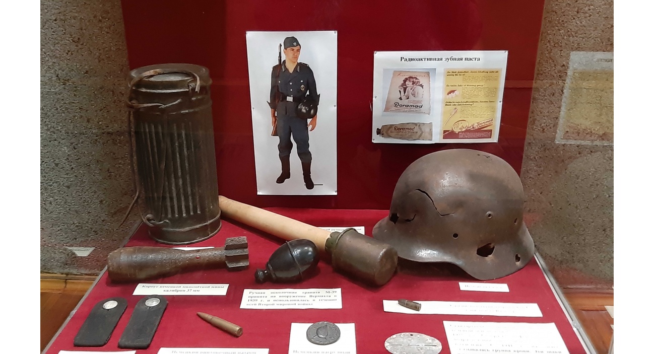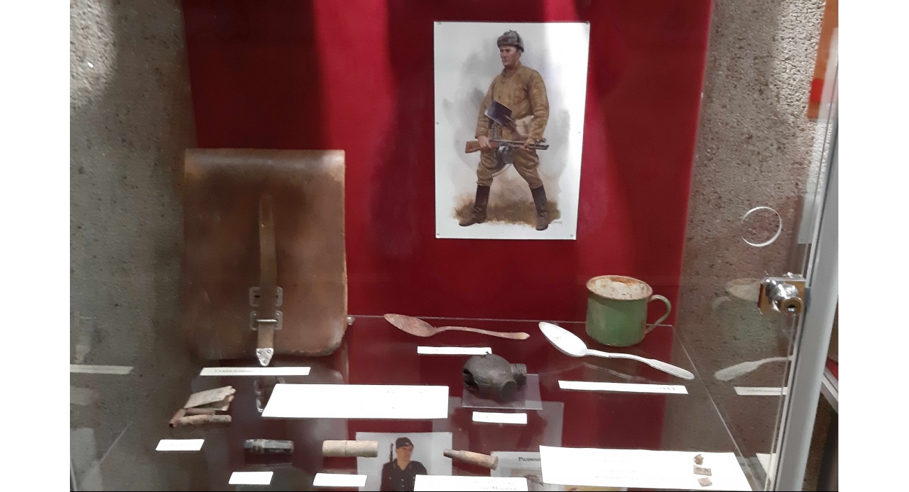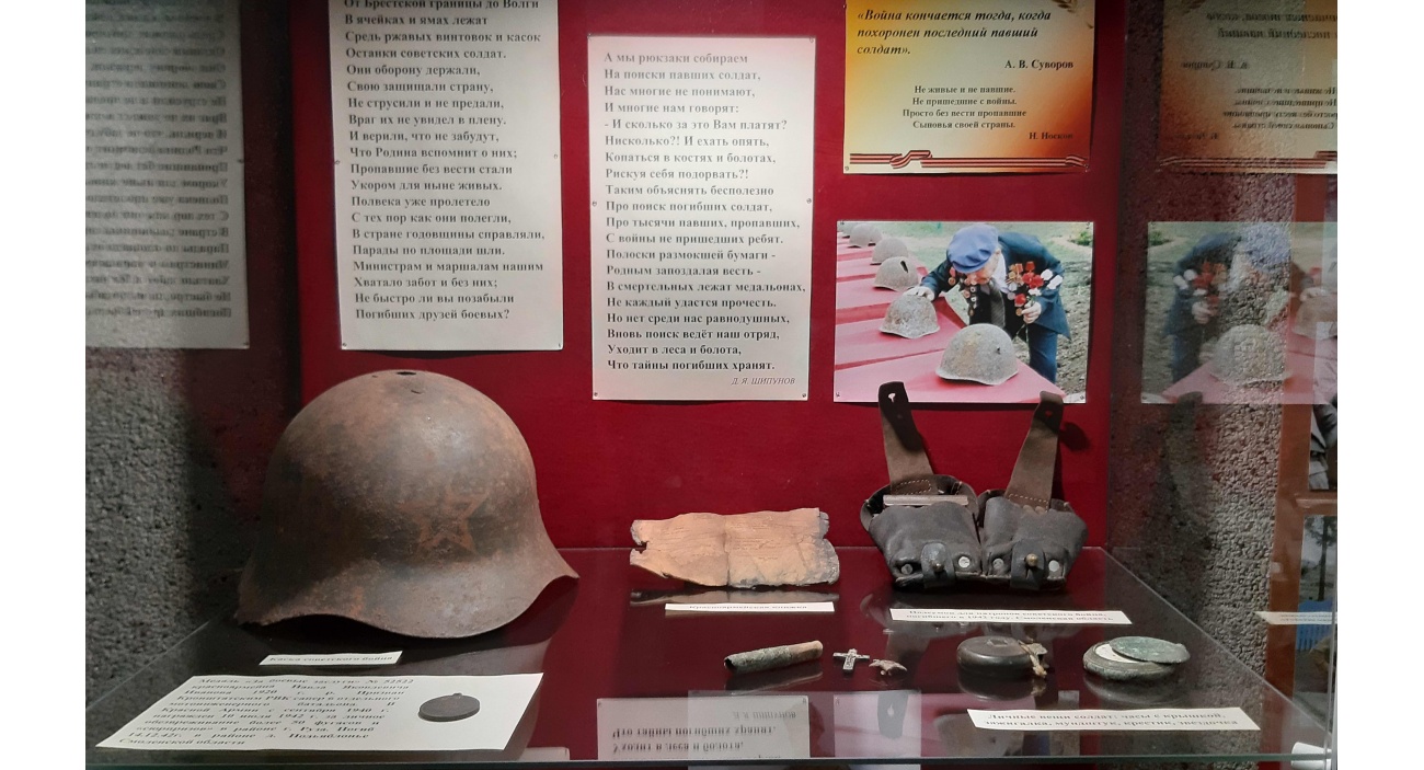 В экспозиции представлены личные вещи солдат, различные виды солдатских медальонов, оружие и боеприпасы, найденные в экспедициях членами поискового движения.