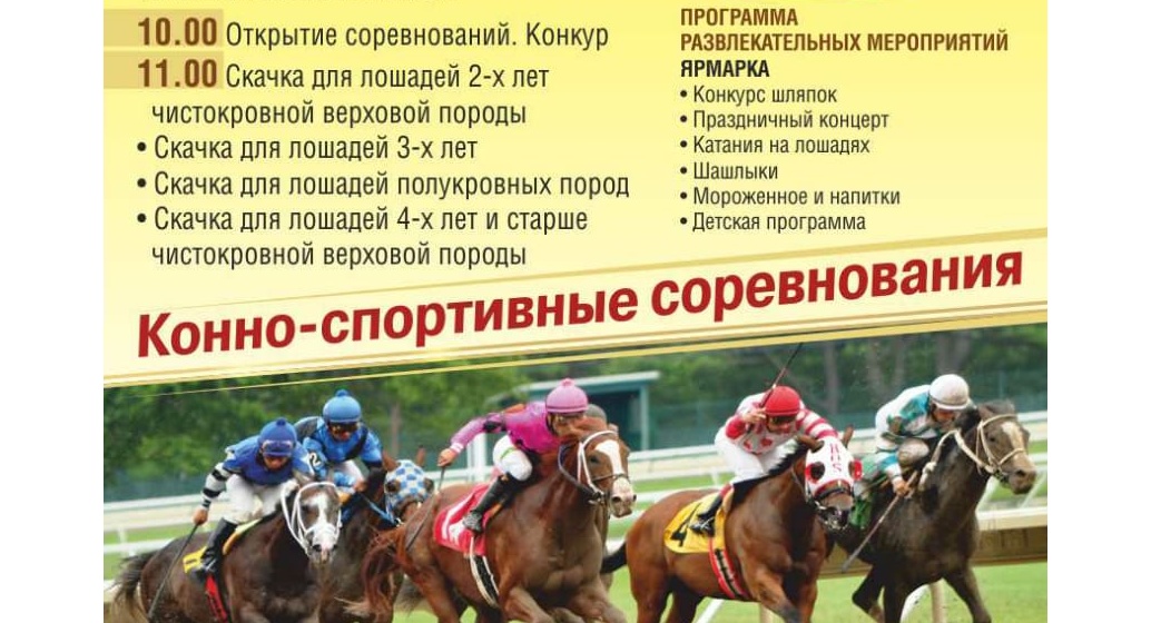Программа развлекательных мероприятий: конкурс шляпок, праздничный концерт, катания на лошадях, шашлыки, мороженное и напитки, детская программа.