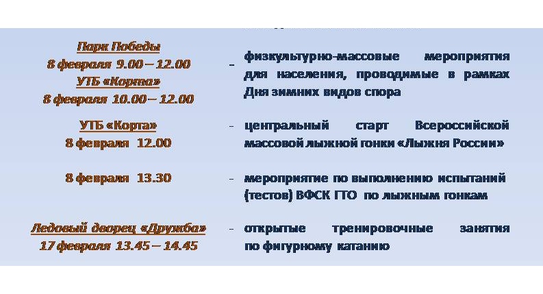 Всероссийская спортивная лыжная гонка «Лыжня России» — самый долгожданный и известный спортивный праздник для любителей лыжного спорта. Она проводится ежегодно с 1982 года. Массовая гонка «Лыжня России» в 2020 году пройдет одновременно в 72 регионах России. Соревнование проводится среди взрослого населения по трем возрастным группам.