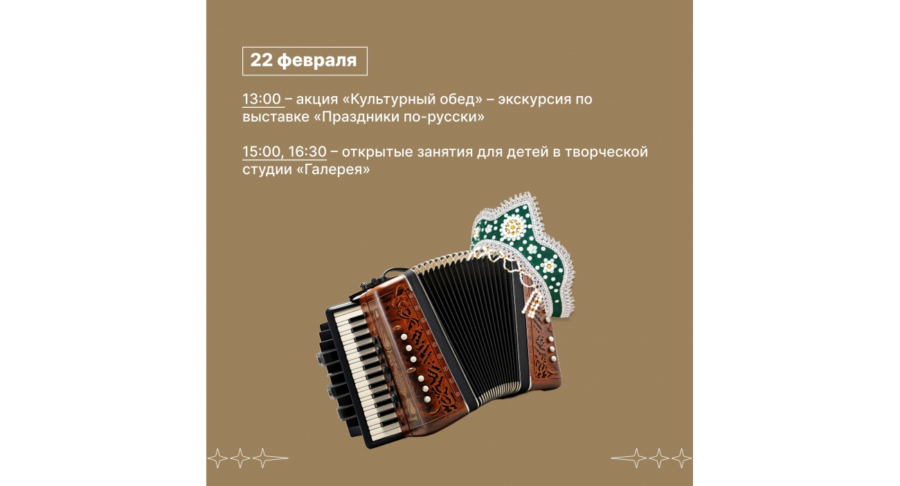 13.00 — 14.00 — Культурный обед. Экскурсия по выставке «Праздники по-русски»