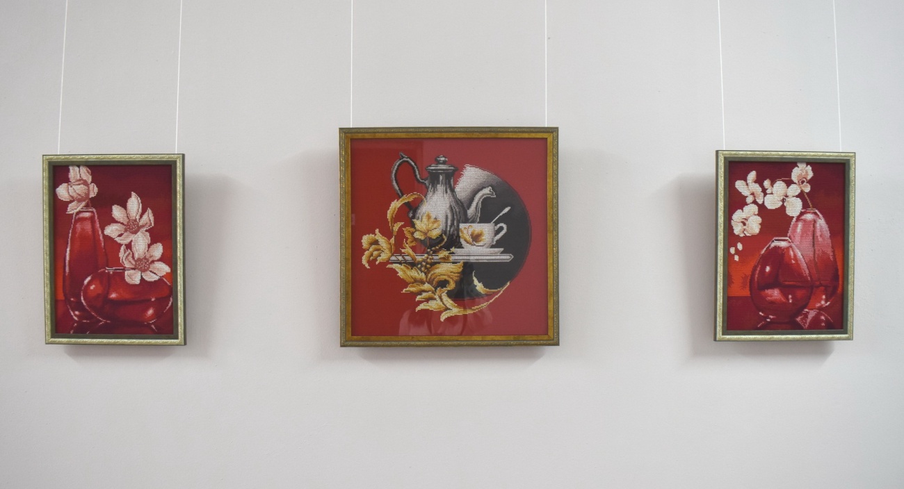 На персональной выставке Галины Тихоновой представлены картины, вышитые крестиком.