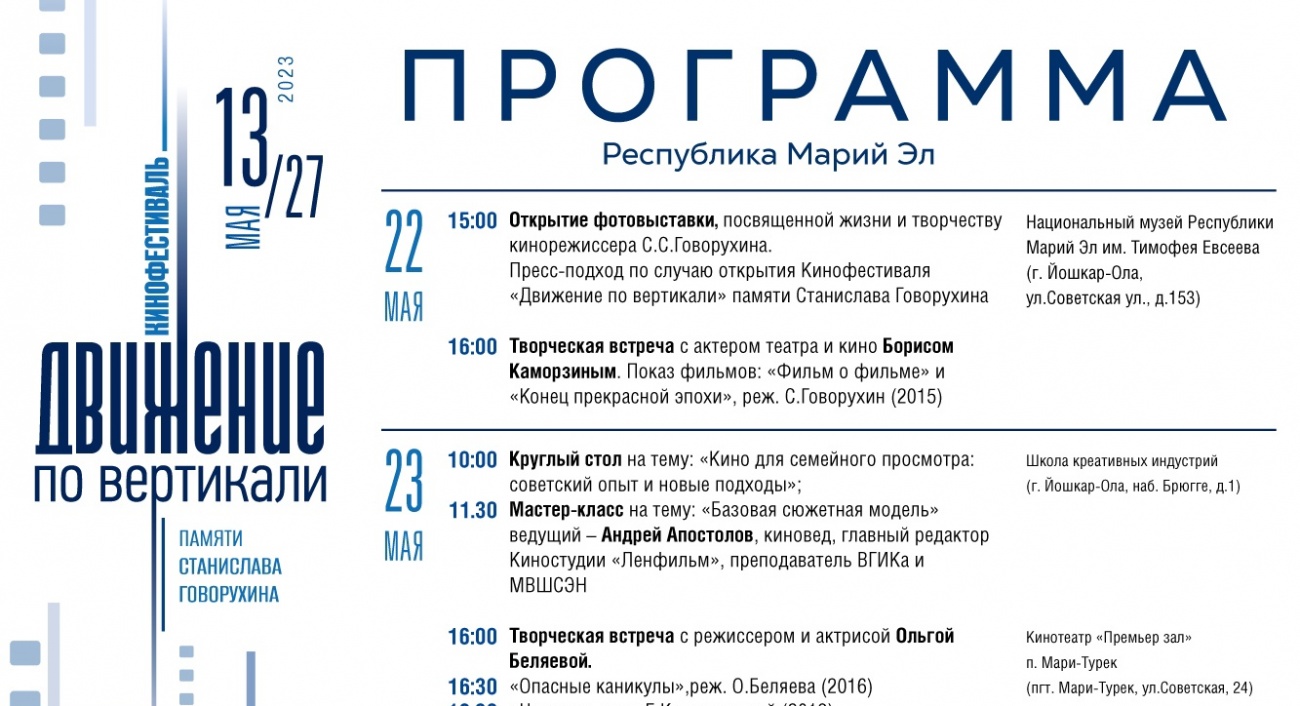 Отдых и развлеченияОткрытие II этапа Кинофестиваля «Движение по вертикали» состоится 13 мая 2023 г. в Центральном парке культуры и отдыха г. Йошкар-Ола кинопоказом фильма «Опасные каникулы», реж. О. Беляева, производство киностудии «Вертикаль», а 20 мая состоится показ фильма «Дневник мамы первоклассника», реж. А. Силкин.