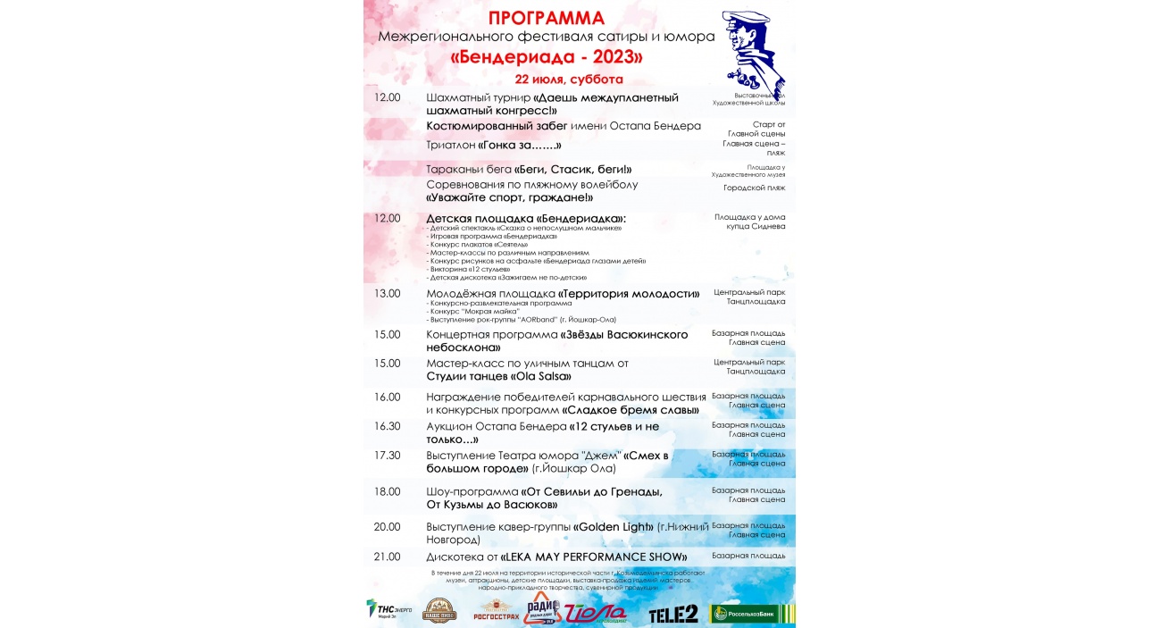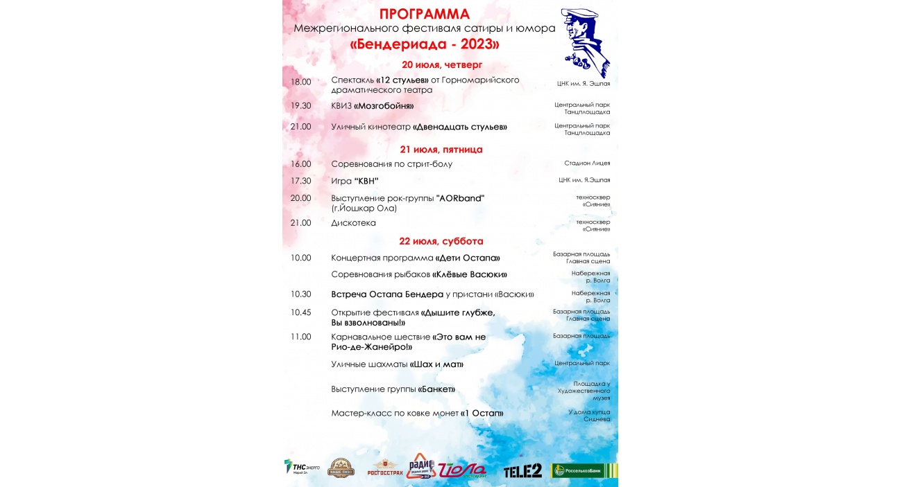 17.30 — выступление Театра юмора «Джем» из Йошкар-Олы. Базарная площадь. Главная сцена.
