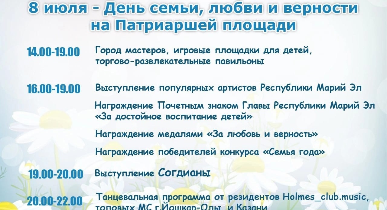 Отдых и развлечения8 июня - День семьи, любви, и верности на Патриаршей площади. 14.00-19.00 - Город мастеров, игровые площадки для детей, торгово-развлекательные павильоны. 16.00-19.00 - Выступление популярных артистов Республики Марий Эл. Награждение Почетным знаком Главы Республики Марий Эл "За достойное воспитание детей". Награждение медалями "За любовь и верность". Награждение победителей конкурса "Семья года". 19.00-20.00 - Выступление Согдианы. 20.00-22.00 - Танцевальная программа от резидентов Holmes_club.music, топовых MC г. Йошкар-Олы и Казани