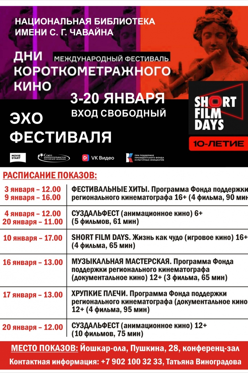 С 3 по 20 января 2024 года Национальная библиотека имени С. Г. Чавайна в очередной раз выступит площадкой «Эха» Международного кинофестиваля «Дни короткометражного кино» (ShortFilmDays).