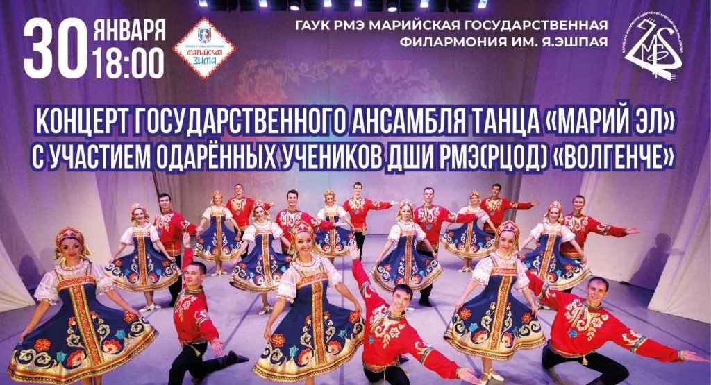 В программу концерта вошли полюбившиеся зрителями хореографическая композиция «Зов невесты», танцевальная сюита «Громка мода» и другие известные постановки ансамбля «Марий Эл». Будущие артисты представят яркие номера «Зимние забавы», «Морозные кружева», «Скоморохи», «Русский перепляс».