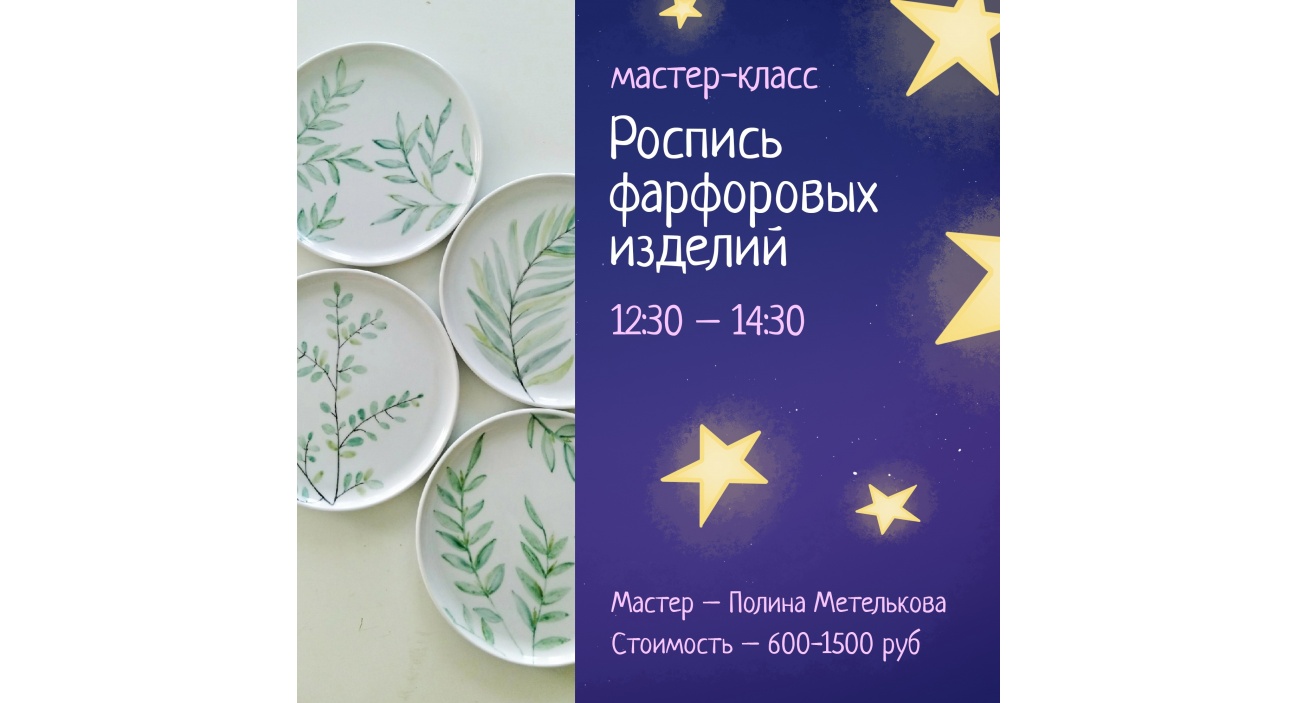 12:30 — 14:30 — роспись фарфоровых изделий вместе с Полиной Метельковой