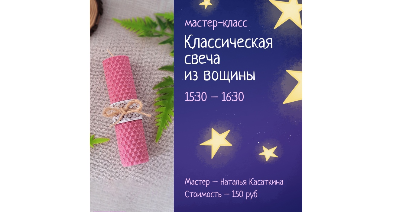 15:30 — 16:30 — делаем классическую свечу из вощины вместе с Натальей Касаткиной