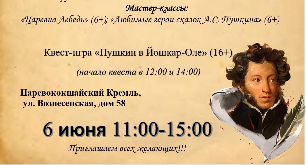 МБУК «Централизованная библиотечная система г. Йошкар-Олы» при поддержке ГБУК РМЭ культурно-исторический комплекс «Царевококшайский Кремль», Управления образования администрации городского округа «Город Йошкар-Ола», АНО «Драм Там Академия» приглашает 06.06.2024 г. с 11-00 по 15-00 принять участие в праздновании Пушкинского дня на территории Царевококшайского Кремля.
