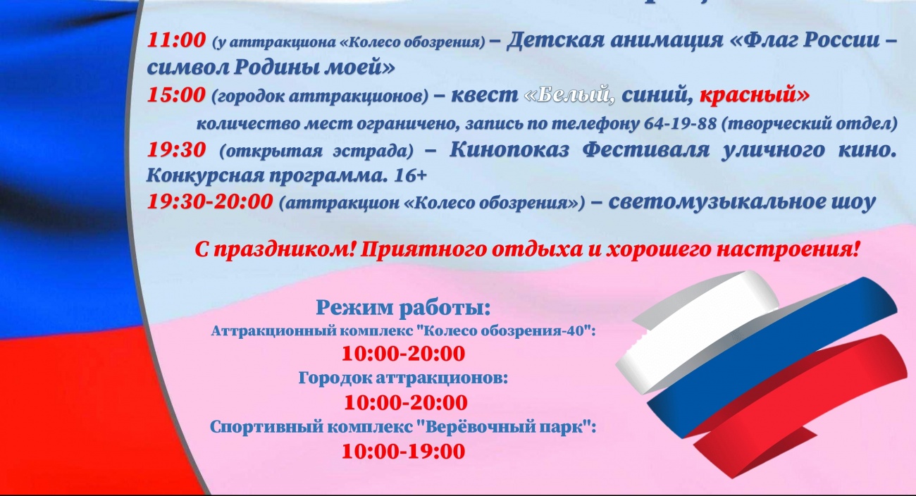 - 11:00 (у аттракциона «Колесо обозрения) — Детская анимация «Флаг России — символ Родины моей»