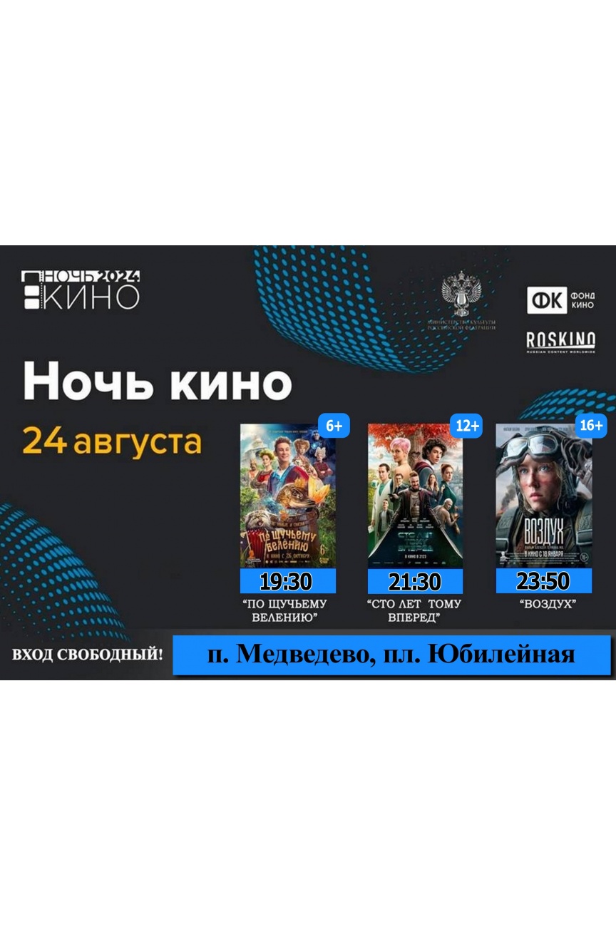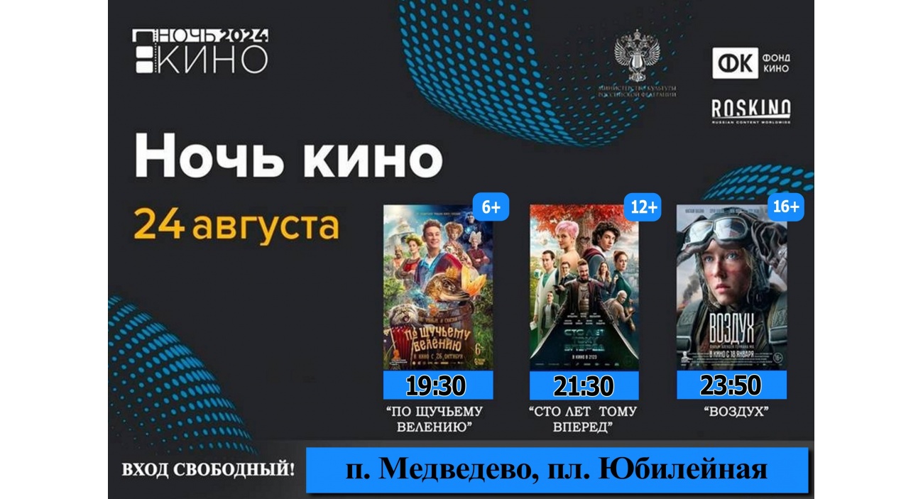 Бесплатные показы, которые состоятся на площади Юбилейная п. Медведево — 24 августа 2024г.: