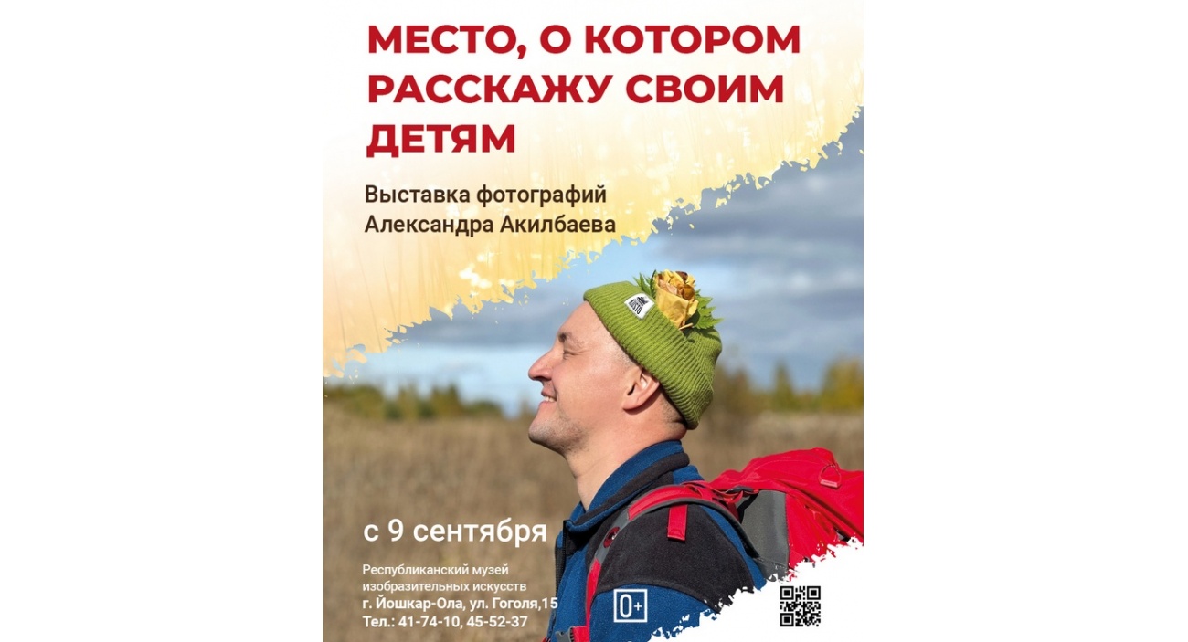 Герой фотовыставки "Место, о котором я расскажу своим детям", Александр Акилбаев, воспевает красоту своей малой Родины — Республики Марий Эл. На своей первой выставке Александр представил фотографии, сделанные им в ходе съёмок авторского проекта "Пешком по республике". Самым сложным, по словам Александра, было отобрать лучшие снимки из 90 000 кадров, сделанных в ходе путешествий.