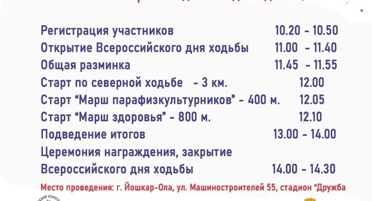 В честь десятилетия развития северной ходьбы в Республике Марий Эл и в рамках Всероссийского дня ходьбы на стадионе «Дружба» 28 сентября (суббота) состоится X физкультурно-спортивный Фестиваль «Ходьба для всех!».