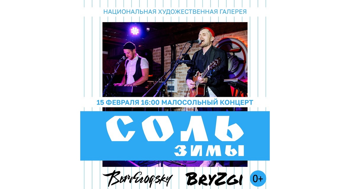 Малосольный концерт в четыре руки «Соль зимы» в исполнении ярких, талантливых музыкантов Евгения Вычегодского и Максима Брызгалова. Творить и размышлять ребята будут в стиле православного эмбиента и дворового инди. Прозвучат авторские песни в акустическом исполнении, а также кавер-версии известных песен в собственном изложении. Лёгкую перчинку музыкальным композициям придадут гармоника и казу.