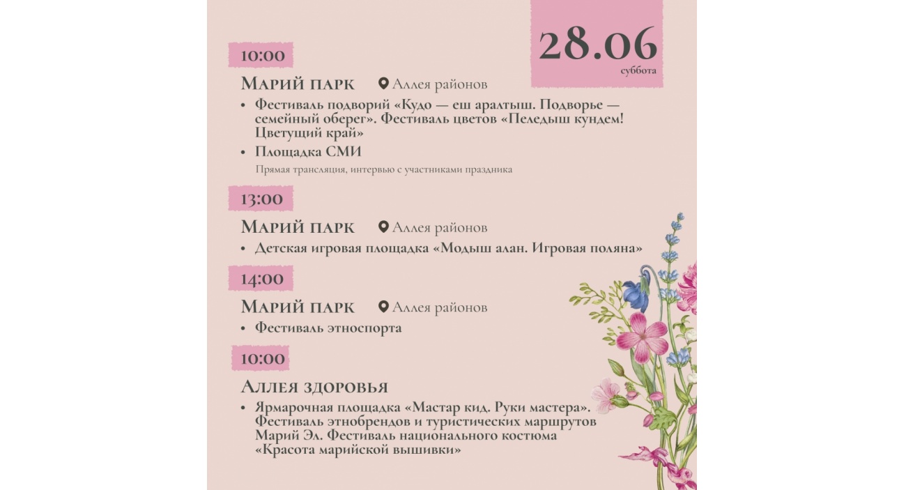 • 14:00 — Фестиваль народного творчества «Ик еш дене. Одной семьей». Концерт творческих коллективов Республики Марий Эл и регионов компактного проживания народа мари. Выступление участников Республиканского фестиваля народного творчества «Салют Победы» к Году Защитника Отечества и 80-летию Победы в Великой Отечественной войне 1941-1945 гг.