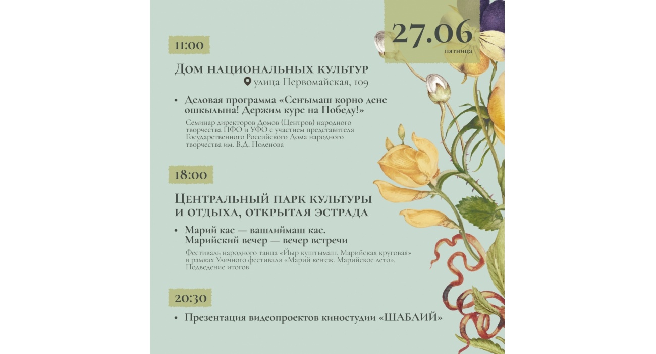 • 17:15 — Межрегиональный молодежный творческий фестиваль «Арт-Мари: Рвезылык. Усталык. Акыл. Арт-Мари: Молодость. Творчество. Интеллект»