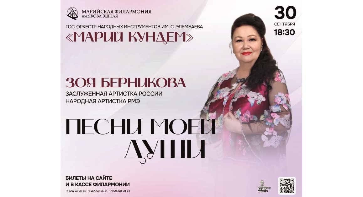 Отдых и развлечения30 сентября в 18:30 в Марийской филармонии им. Я. Эшпая состоится сольный концерт Заслуженной артистки России, народной артистки Республики Марий Эл Зои Берниковой «Муро - чон кумылем» («Песни моей души»).