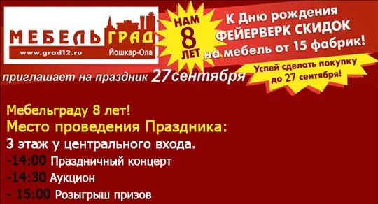Место проведения Праздника: ВЦ «Мебельград Йошкар-Ола», г. Йошкар-Ола, ул. Строителей 95, 3 этаж, через центральный вход.