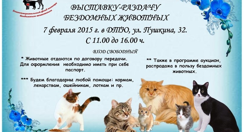 Организаторы выставки с благодарностью примут от посетителей мероприятия корма для кошек и собак, лекарства и расходные аксессуары. Деньги собранные от аукциона пойдут на содержание, кормление и лечение животных, находящихся у них не содержании.