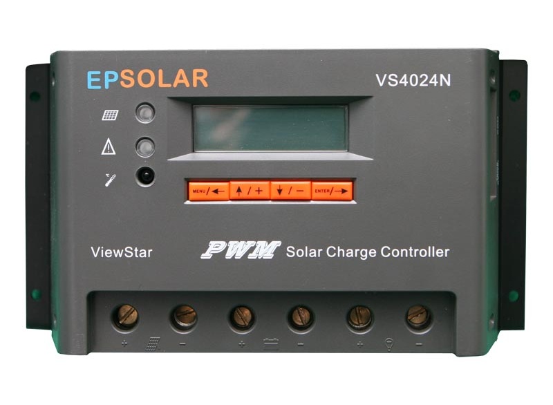 EPSolar VS4024N 40A, 12/24 V Номинальное напряжение: 12/24В Ток на входе: 40 А (max) Технология: ШИМ Контроллер ViewStar VS4024N обладает встроенным графическим дисплеем, на котором отображаются все рабочие параметры (ток и напряжение во всех цепях, температура и пр.) и при помощи которого можно произвести гибкую настройку абсолютно всех параметров контроллера. Эта модель контроллера заряда поддерживает работу с солнечными батареями мощностью до 480 Вт при напряжении 12 В или до 960 Вт при напряжении 24 В. Напряжение системы (12 или 24 В) выбирается контроллером автоматически на основе измерения напряжения подключенных аккумуляторов. Напряжение подключаемых к контроллеру солнечных батарей должно быть равно напряжению подключенного аккумулятора (т.е. нельзя, например, использовать солнечную батарею с напряжением 24 В для зарядки аккумулятора 12 В). Это особенность всех контроллеров заряда PWM-типа. В этой модели контроллера есть 2 программируемых таймера для управления нагрузкой (например, для включения ночного освещения в определенное время).