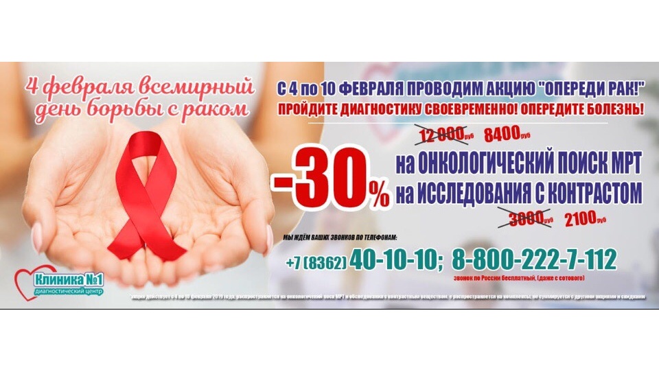 Только с 4 по 10 февраля мы предлагаем Вам пройти обследования на выявление новообразований с выгодной скидкой*: